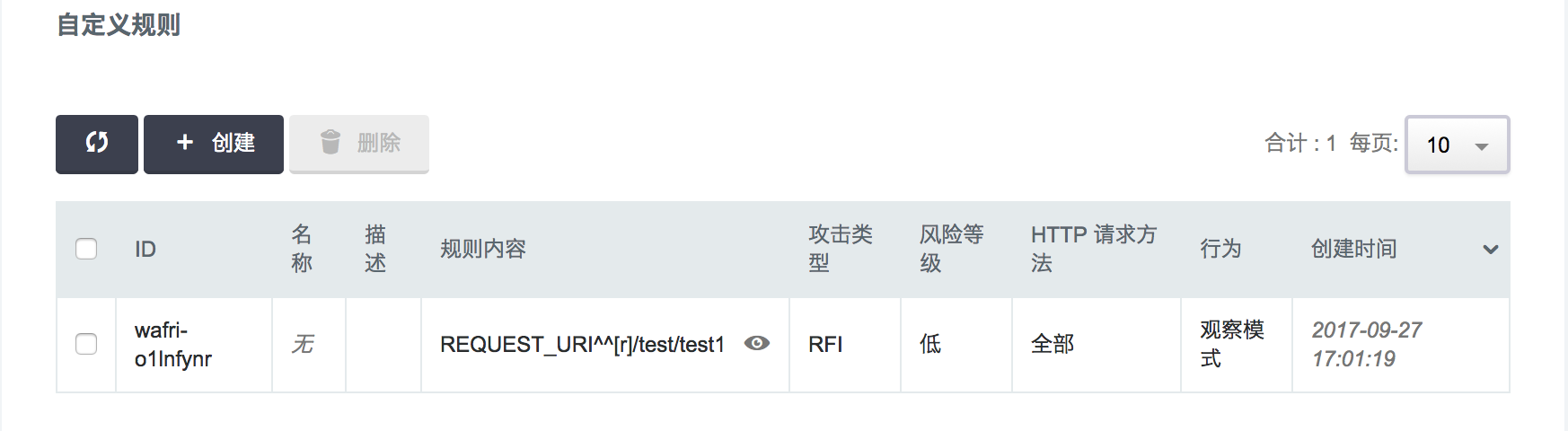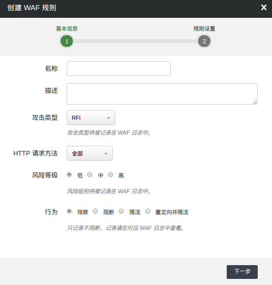 注解: 新增规则时请配置为观察模式,待规则稳定之后再修改为阻断模式。