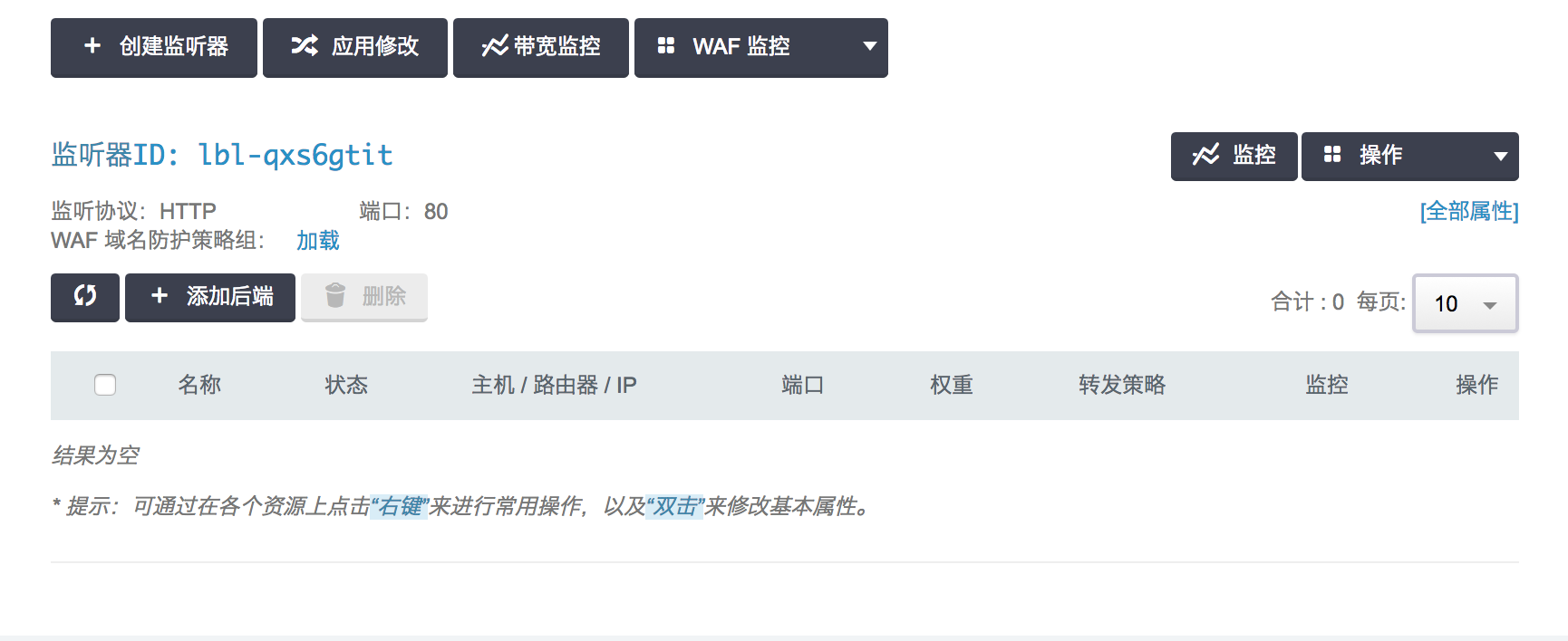 当负载均衡器创建完成之后,我们需要新建一个 HTTP/HTTPS 协议的监听器。 监听器建好之后,可以给其配置 WAF 域名防护策略。