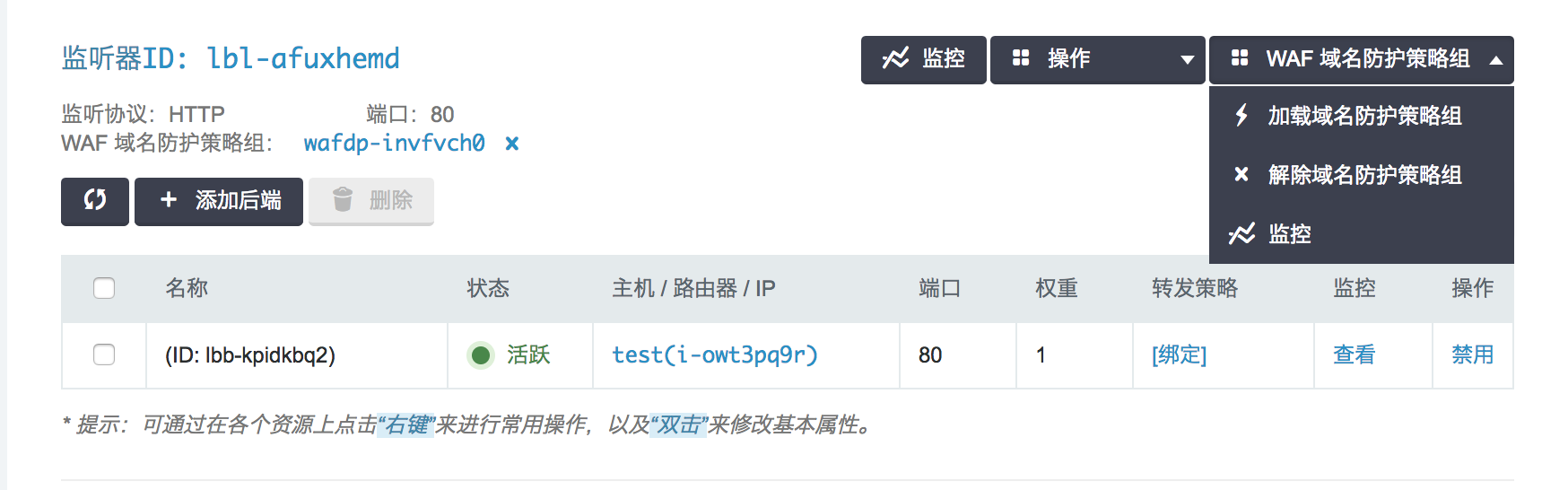 绑定之后,在监听器下方会列出来所加载的 WAF 域名防护策略: