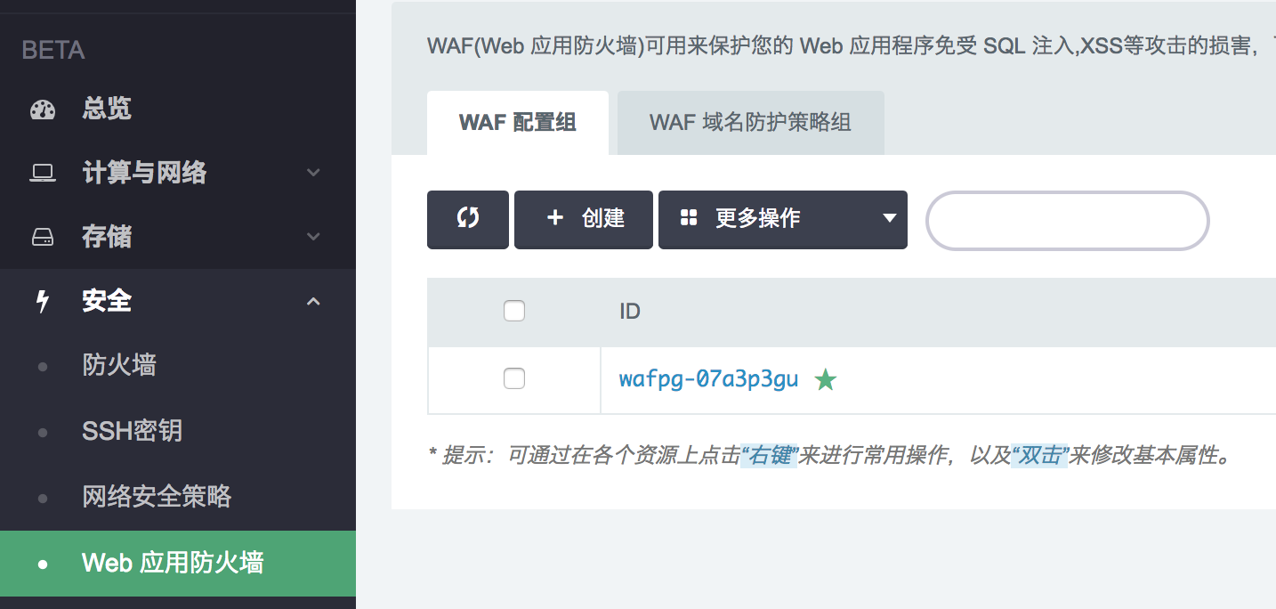 目前没有配置 WAF 域名防护策略,所以这里是空的。