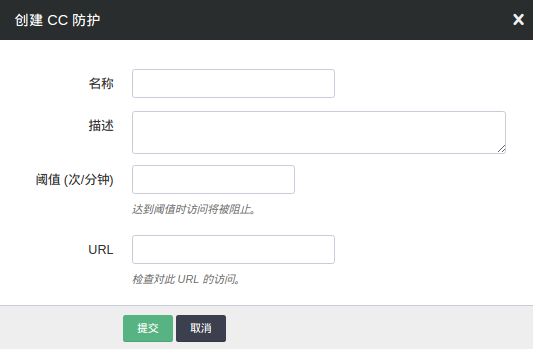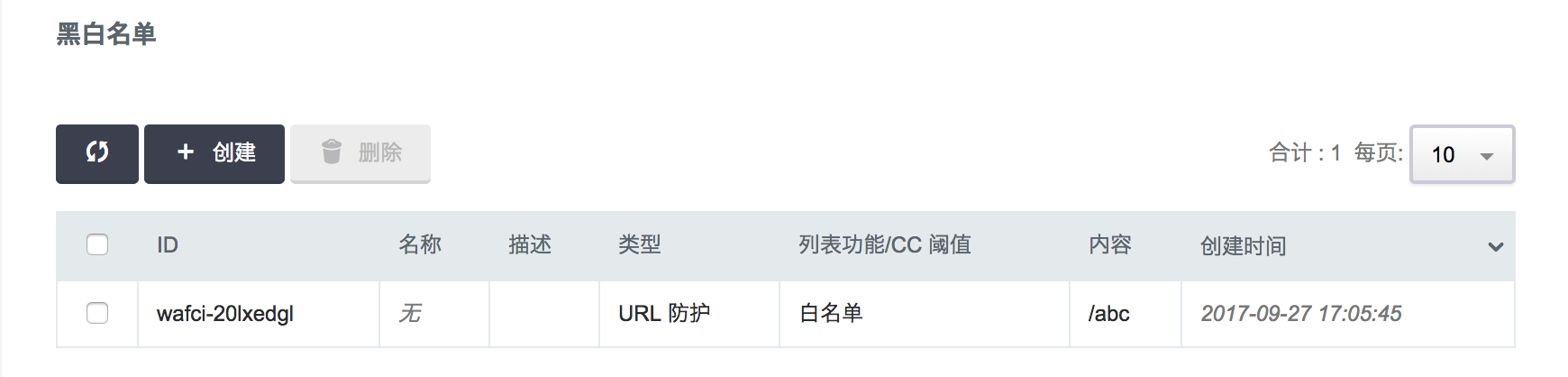 除了可以配置自定义的规则,还可以配置自定义的黑白名单以及 CC 防护功能,点击 “黑白名单” 下的 “创建”: