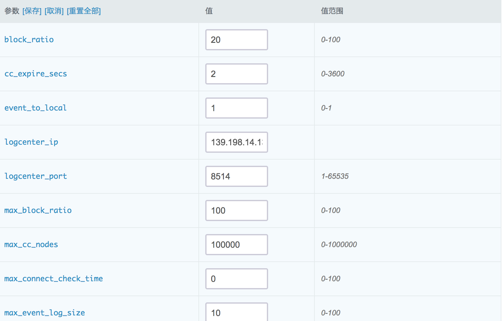 WAF 配置组是针对负载均衡器的全局配置,这里可以针对 WAF 功能做微调,比如配置 WAF 日志发送的地址等,可修改的选项如下: